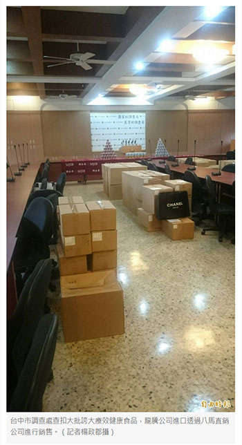 A large number of nutritional food products that claims exaggerated efficacy were seized in Taichung Total Swiss direct marketing company, Taichung branch. Said to regulate the solution of blood to improve the intestinal tract, eliminate fatigue, strengthen bones, immune regulation, etc., They are sold without permission, the main suspect Wang Wenqin, Huang and other 7 people were arrested after the violation of food hygiene management law. From 100 to 800 thousand NTD for bailout. The product turnover is more than 3.2 billion NTD, illegal income is still in liquidation.